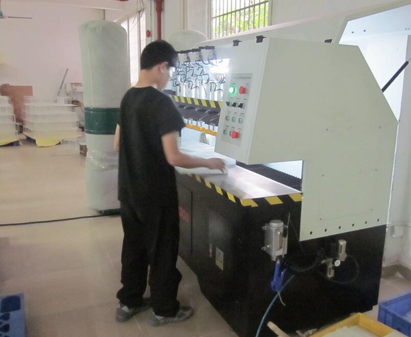 由上图看一看出,我们工厂正在对亚克力钻头展示架进行布轮抛光,技术员将亚克力展示架材料慢慢靠近布轮机,机器快速转动进行亚克力抛光,这种布轮抛光+抛光膏,抛出效果是非常光亮,可以满足90%以上的高质量要求。